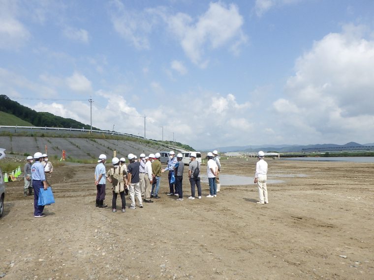 小田川の堤防強化工事及び付替え工事は工事着手後3年が経過し、工事が最盛期を迎えています。このたび、普段ご協力をいただいている地域の皆様に工事の進捗状況を見学いただきました。